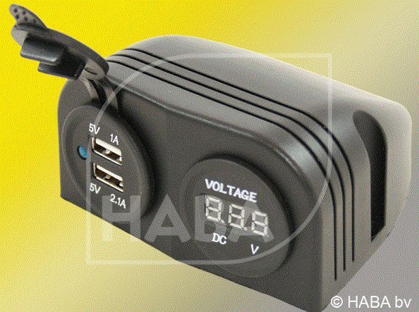 1x 1A + 1x 2.1A USB lader (geschikt voor het opladen van tablets zoals iPad, Samsung Galaxy, etc) 1x Voltage indicator opbouw