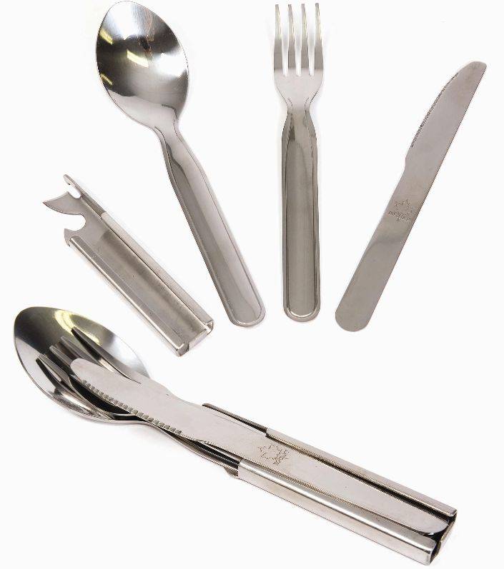 Zware kwaliteit RVS bestek: mes (16,5cm), lepel (18cm), vork (17,5cm), inclusief houder met blik/flesopener (11,5cm), in etui.