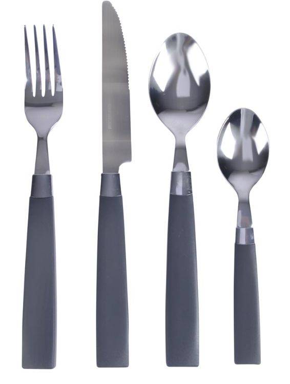 Extra stevige 24-delige 6-persoons bestekset, met kunststof heft. Lengte: lepeltje 15cm; lepel 20cm; vork 20,5cm; mes 22,5cm. Kleur: grijs.