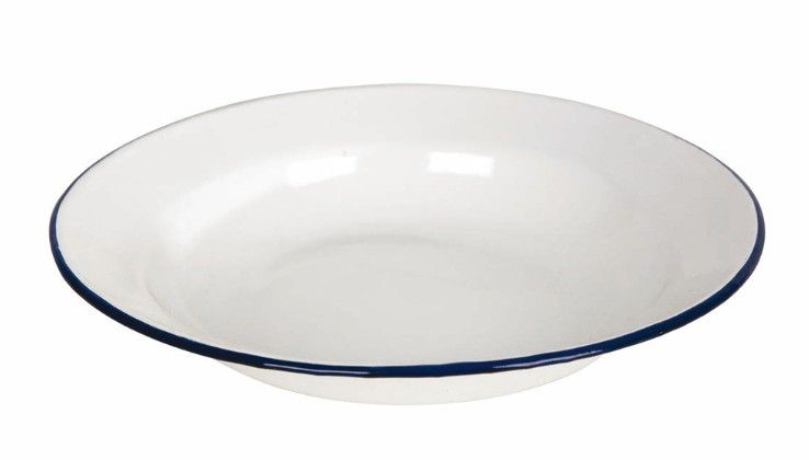 Emaille diep bord. Afmetingen: diameter: 24cm. Kleur: wit met blauwe rand.