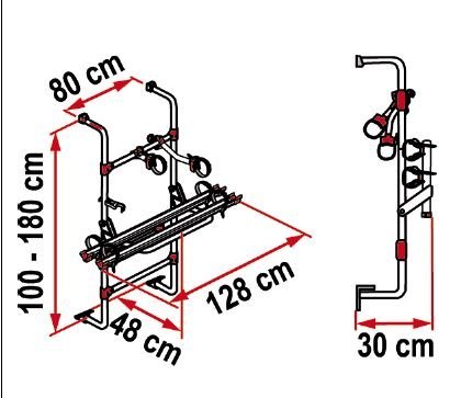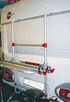 Montage aan het onderframe van de caravan! Geschikt voor o.a. Bürstner, Chateau etc. Geschikt voor 2 fietsen. Telescopic wandframe, verstelbaar van 100 tot 180 cm. Maximaal draagvermogen 35 kg.