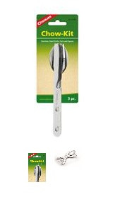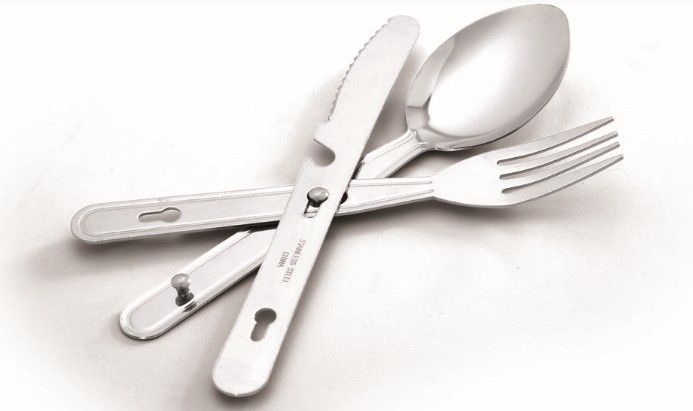 Driedelige RVS bestekset. Mes, vork en lepel aan elkaar te bevestigen met schuifnagel.