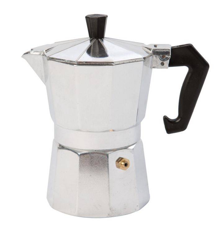 Aluminium espresso maker, goed voor 3 koppen. Geschikt voor gebruik op een kampvuur. Afmetingen: diameter 9cm; breedte 15cm; hoogte 15cm. Inhoud: 150ml.