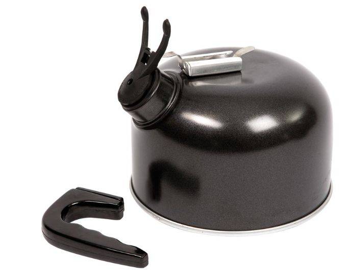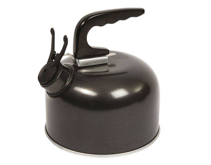 Aluminium gecoate waterketel met wegklapbare fluitdop en een afneembare greep. Afmetingen: diameter 15,3cm; hoogte 17cm. Inhoud: 1 liter. Kleur: zwart.