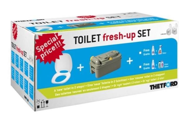 Set bestaat uit: Bril, deksel, afvaltank, Cassette Tank Cleaner (1,5ltr) en Bathroom Cleaner (750ml).