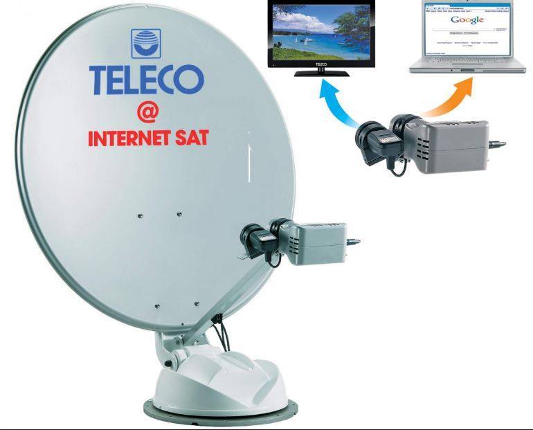 Met de nieuwe Internet Sat biedt Teleco u de mogelijkheid om ook in uw camper/caravan gebruik te maken van alle bidirectionele breedbandverbindingsdiensten die door Astra 2 Connect via de satelliet ASTRA op 23,5° Oost geboden worden. Dit betekent dat behalve surfen op Internet en e-mailen, u ook kunt telefoneren. Om de Internet- en telefoondienst te activeren is het voldoende om het Internet Sat systeem op uw camper of caravan te installeren. Het Internet Sat systeem bestaat uit: