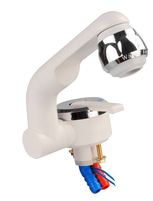 De Barwig Eenhandig mengkranen type Perfect 2000 zijn gemaakt van kunststof en zijn voorzien van keramische afdichting schijven. De waterstraal is instelbaar. Door de lage inbouwhoogte van 40 mm past deze zelfs in een lage wasbak met afdekking. Ook is de wateruitloop draaibaar. Bestand tegen een druk van maximaal 3 bar waardoor deze zowel voor gewone pompen als drukpompen geschikt is. Een veel gebruikte kraan bij TABBERT en HOBBY. Inbouw hoogte: 40 mm. Druk: max. 3 bar. Aansluiting: 2 x tule 8/10 mm. Montagegat: 27 mm.