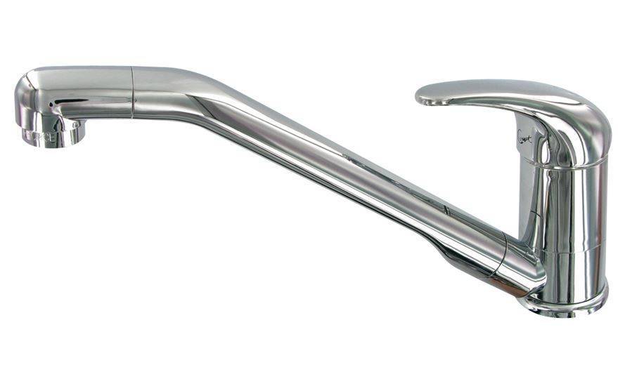 Chrome kraan met schakelaar. 1 "schroefdraad en een uitloop. Bestand tegen max. 3 bar waterdruk en heet water. Afhankelijk van het model met twee nylon flex slangen (mengkraan) of met 1 nylon flex slang voor alleen koudwater. De lengte van de flex slangen zijn ca. 350 mm passend voor waterslangen van ø 8 of ø 10 mm doorsnee. De Een hands-Mengkraan type NOVA met uittrekbare doucheslang heeft een aansluiting van ø 10 mm. Montage gat: ø 33 mm