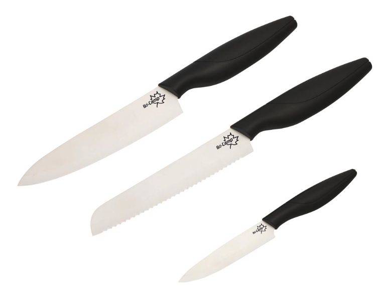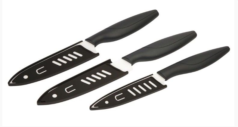Fraaie messenset met volledig keramisch lemmet. Koksmes, broodmes en groentenmes. Volledig roestvrij en blijvend scherp. Inclusief lemmethoes. Afmetingen: 2x lengte 30cm; 1x lengte 19cm. Kleuren: zwart handvat en wit lemmet.