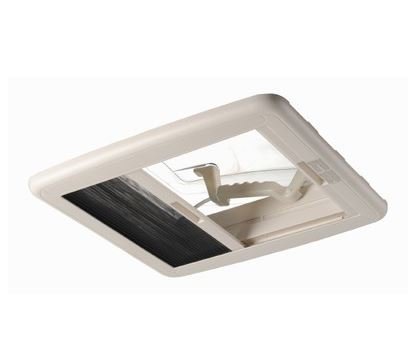 Mini Heki S dakluik is in 4 standen d.m.v. handvaten te openen. Past in een gatmaat van 400x400mm. Grote dubbelglas koepel van onbreekbaar polycarbonaat. Met verduistering en muggengaas. Voorzien van ventilatie.