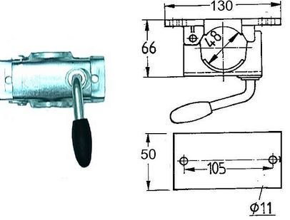 Neuswielklem voor een Ø48 mm neuswiel. De 2 montagegaten zijn hart op hart 105 mm van elkaar verwijderd.