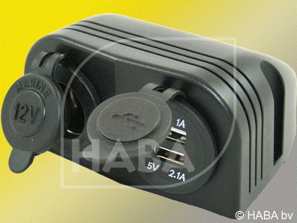 1x 1A + 1x 2.1A USB lader (geschikt voor het opladen van tablets zoals iPad, Samsung Galaxy, etc) 1x 12V contactdoos opbouw