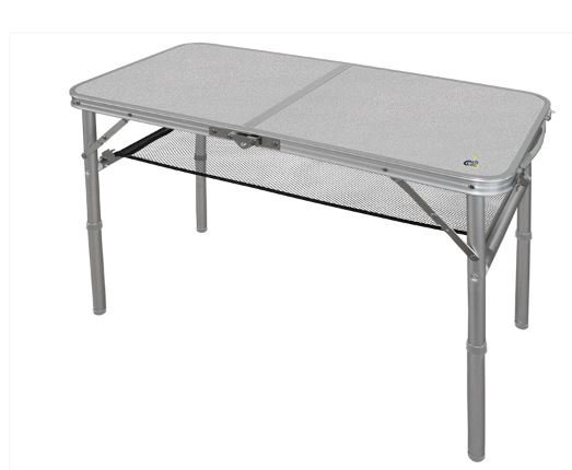 Deze opvouwbare tafel is voorzien van een lectuurnet en een borgclip tegen het dubbelvouwen van het bovenblad.