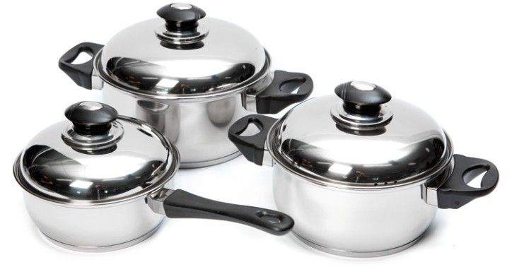 Luxe 3-delige robuuste RVS kookset bestaande uit een steelpan en 2 kookpannen met extra dikke dubbelwandige capsule bodems en fraaie hittebestendige handgrepen. Afmetingen steelpan: diameter 16cm; hoogte 7,5cm. Afmetingen kookpannen: diameter 18cm en 20cm; hoogte 9cm en 10cm. Inhoud steelpan: 1,5 liter. Inhoud kookpannen: 2,3 liter en 3,2 liter.