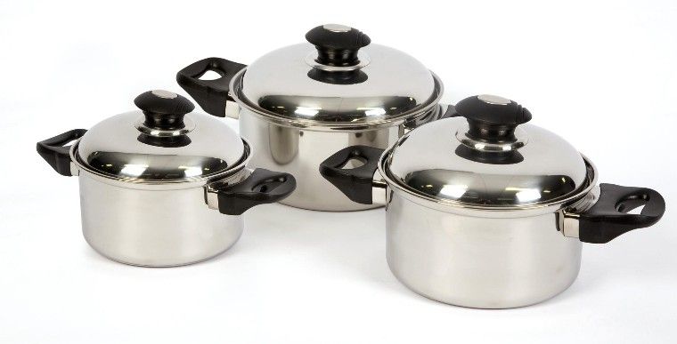 Luxe RVS 3-delige lage kookset met fraaie hittebestendige handgrepen. Afmetingen: diameter 14cm, 16cm en 18cm; hoogte: 7cm, 8cm en 9cm. Inhoud: 1,1 liter, 1,6 liter en 2,3 liter.