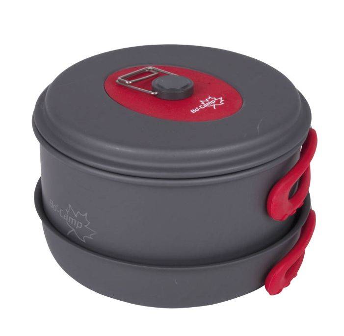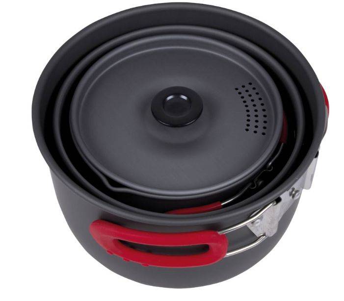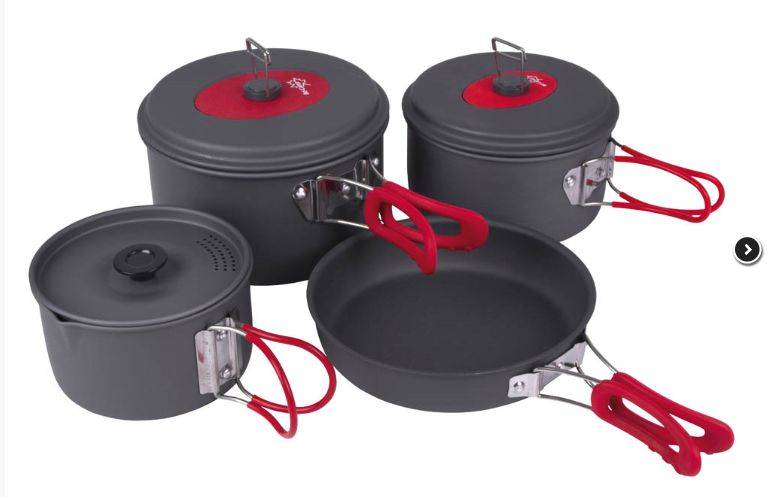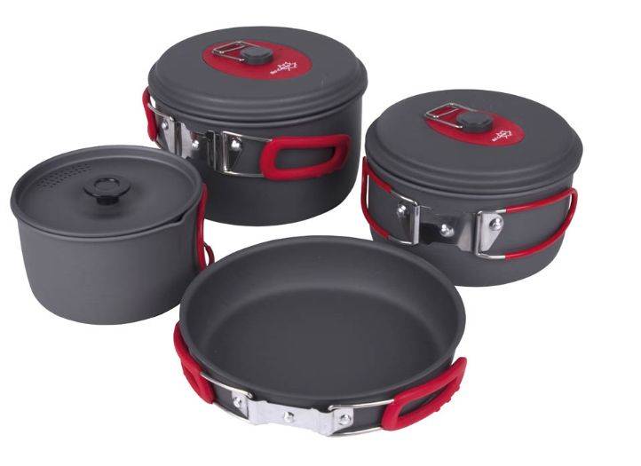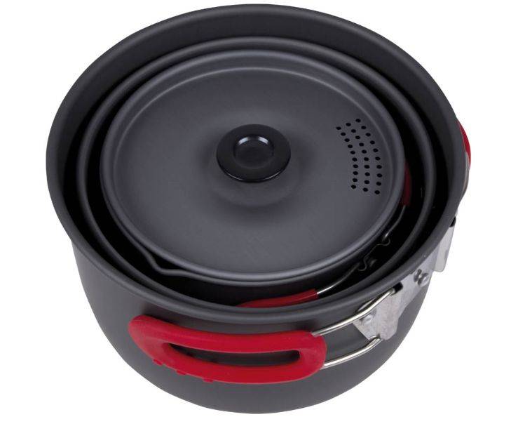 Complete lichtgewicht kookset bestaande uit 3 kookpannen met deksel en een koekenpan van extra gehard geanodiseerd aluminium. Elke pan is voorzien van een hittebestendige klapgreep. Geschikt voor benzinebranders en minder gevoelig voor aanbakken. Bij uitstek geschikt voor outdoor gebruik. Afmetingen kookpannen: diameter 13,5cm, 15,5cm en 17,5cm; hoogte 7,5cm, 8,5cm en 10,5cm. Afmetingen koekenpan: diameter 18cm; hoogte 4,5cm. Inhoud kookpannen: 1,1 liter, 1,6 liter en 2,5 liter. Kleur: grijs/rood.