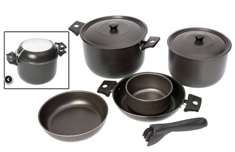 6-Delige aluminium kookset met anti-aanbaklaag. Bestaande uit 2 kookpannen, 1 steel- en kookpan-in-1, 2 koekenpannen met anti-aanbaklaag, 2 deksels, een kunststof pannengreep en een elastiek voor transport. Afmetingen kookpannen: diameter 20cm en 22cm; hoogte 13cm en 14,5cm. Deksels diameter: 20cm en 22cm.Afmetingen steel en kookpan-in-1: diameter 14cm; hoogte 7cm. Afmetingen koekenpannen: diameter 20cm en 22cm; hoogte 4,5cm en 5cm. Inhoud kookpannen: 1,1 liter, 4,1 liter en 5,5 liter.
