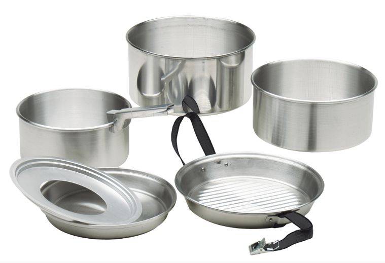 7-Delige aluminium nestbare kookset. Bestaande uit 3 kookpannen, 2 deksels en koekenpan-in-1, een stapelring, een pannengreep en een riempje. Afmetingen kookpannen: diameter 17cm, 18cm en 20cm; hoogte 8cm, 8cm en 10cm. Afmetingen deksel en koekenpan-in-1: diameter 18cm en 20cm; hoogte 3cm en 4cm. Inhoud kookpannen: 1,8 liter, 2,1 liter en 3,3 liter.