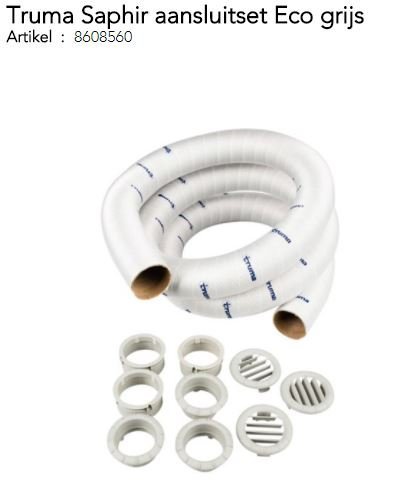 Komplete aansluitset tbv de luchtverdeling voor de Truma Saphir Airconditioners in de “eco” toepassing. Inclusief 3 mtr koude luchtbuis,3 eindstukmoeren EM, 3 eindroosters EN en 3 lamelroosters LA grijs.