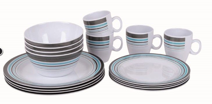Hoogwaardig 100% melamine, 16-delig servies bestaande uit 4 sets: bord diameter 25,5cm; ontbijtbord diameter 20,5cm; kom diameter 15cm; mok diameter 8,5cm. Vaatwasmachinebestendig. Vrijwel onbreekbaar en krasvast. Kleur: grijs en blauw.