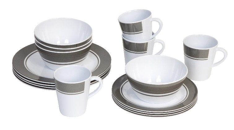 Hoogwaardig 100% melamine, 16-delig servies bestaande uit 4 sets: bord diameter 25,5cm; ontbijtbord diameter 20,5cm; kom diameter 15cm; mok diameter 8,5cm. Vaatwasmachinebestendig. Vrijwel onbreekbaar en krasvast. Kleur: grijs en wit.