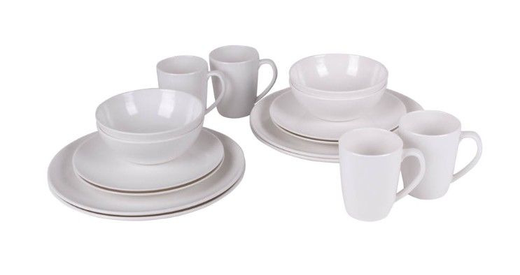 Hoogwaardige 100% melamine serviesset, 16-delig bestaande uit 4 sets: bord diameter 28cm; ontbijtbord diameter 21,5cm; kom diameter 15,5cm; mok diameter 8cm. Vaatwasmachinebestendig. Vrijwel onbreekbaar en krasvast. Kleur: porselein.