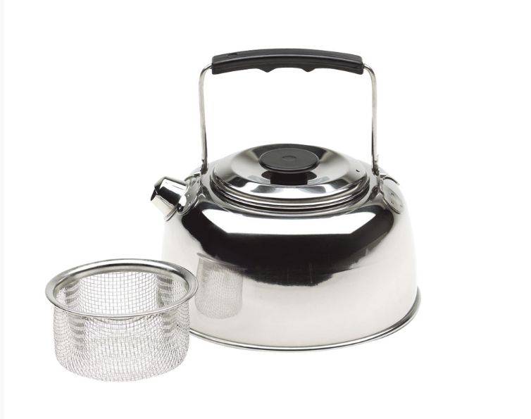Gepolijste RVS waterketel. Inclusief metalen theezeef en geïsoleerd hengsel. Afmetingen: diameter 14,5cm; hoogte 9,5cm. Inhoud: 750ml.