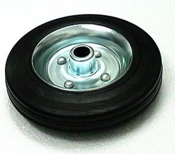 Los wiel voor een neuswiel, de afmeting is 200x50 mm. De velg is van staal en de band is massief rubber.