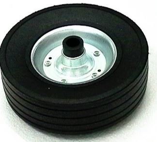 Los wiel voor een neuswiel, de afmeting is 225x65 mm. De velg is van staal en de band is massief rubber.