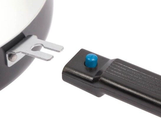 Ruimtebesparende hoogwaardige aluminium pan met ceramische anti-aanbaklaag en afneembare steel. Afmetingen: diameter 28cm; hoogte 8cm; dikte 2,2mm. Inhoud: 5 liter. Kleur: zwart en wit.